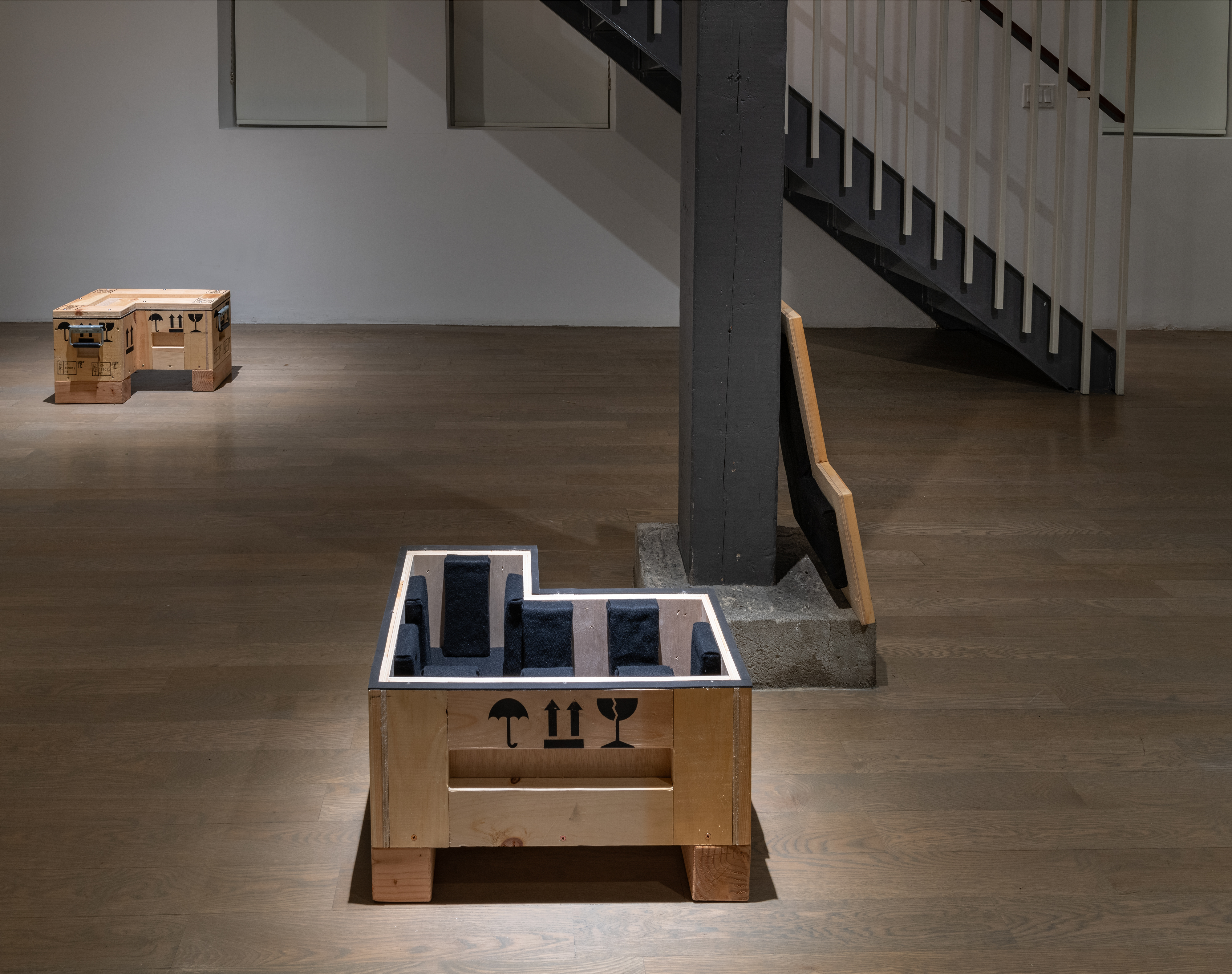 Game Transfer Phenomena consists of 7 crates made to hold objects derived from Tetris’s 7 Tetromino shapes. The installation takes its name from repetitive gameplay’s influence on spatial reasoning and the visual/auditory hallucinations it induces. These perceptual occurrences were first observed following the wider release of Tetris during the late 1980s and are also called “The Tetris Effect.”